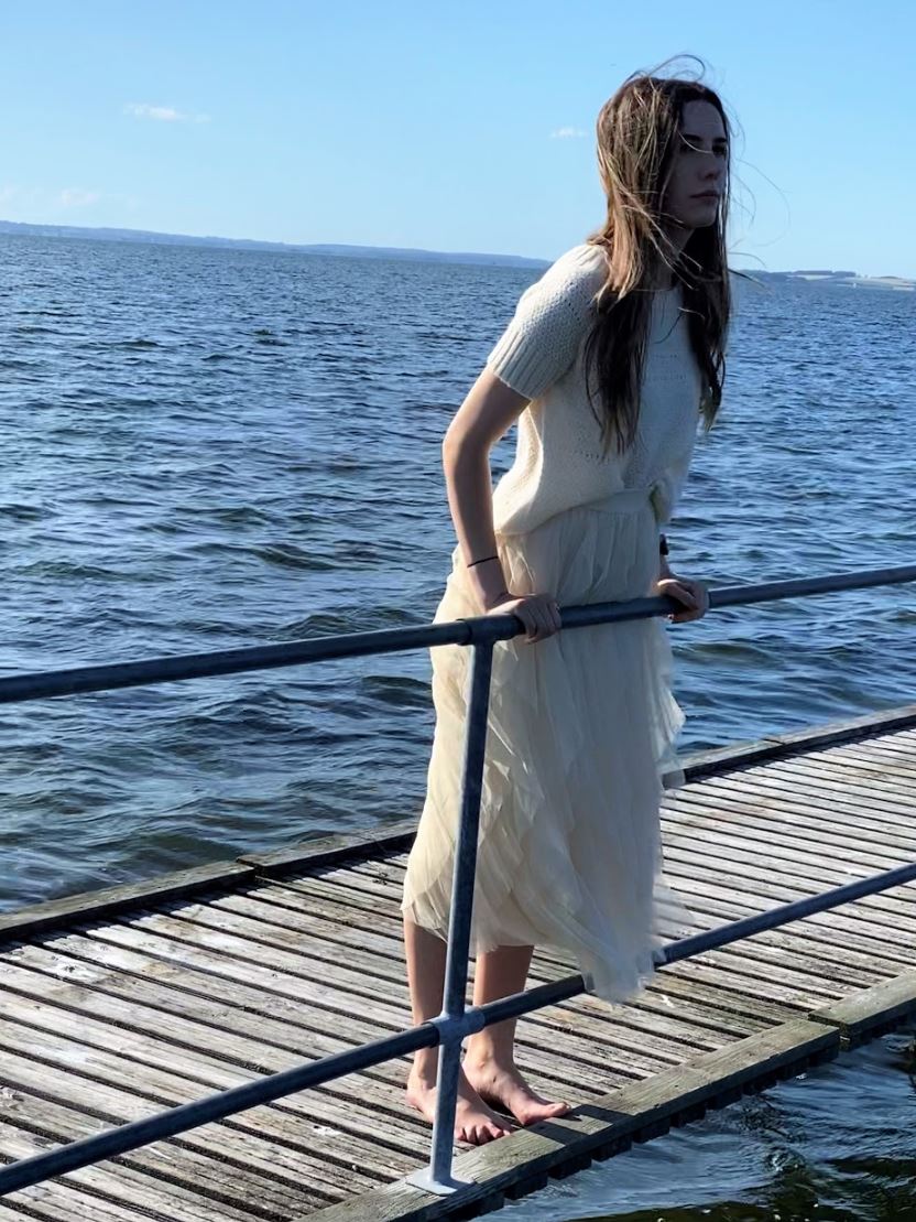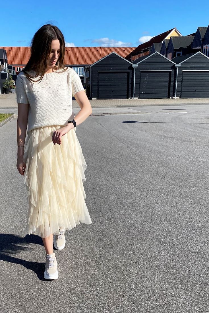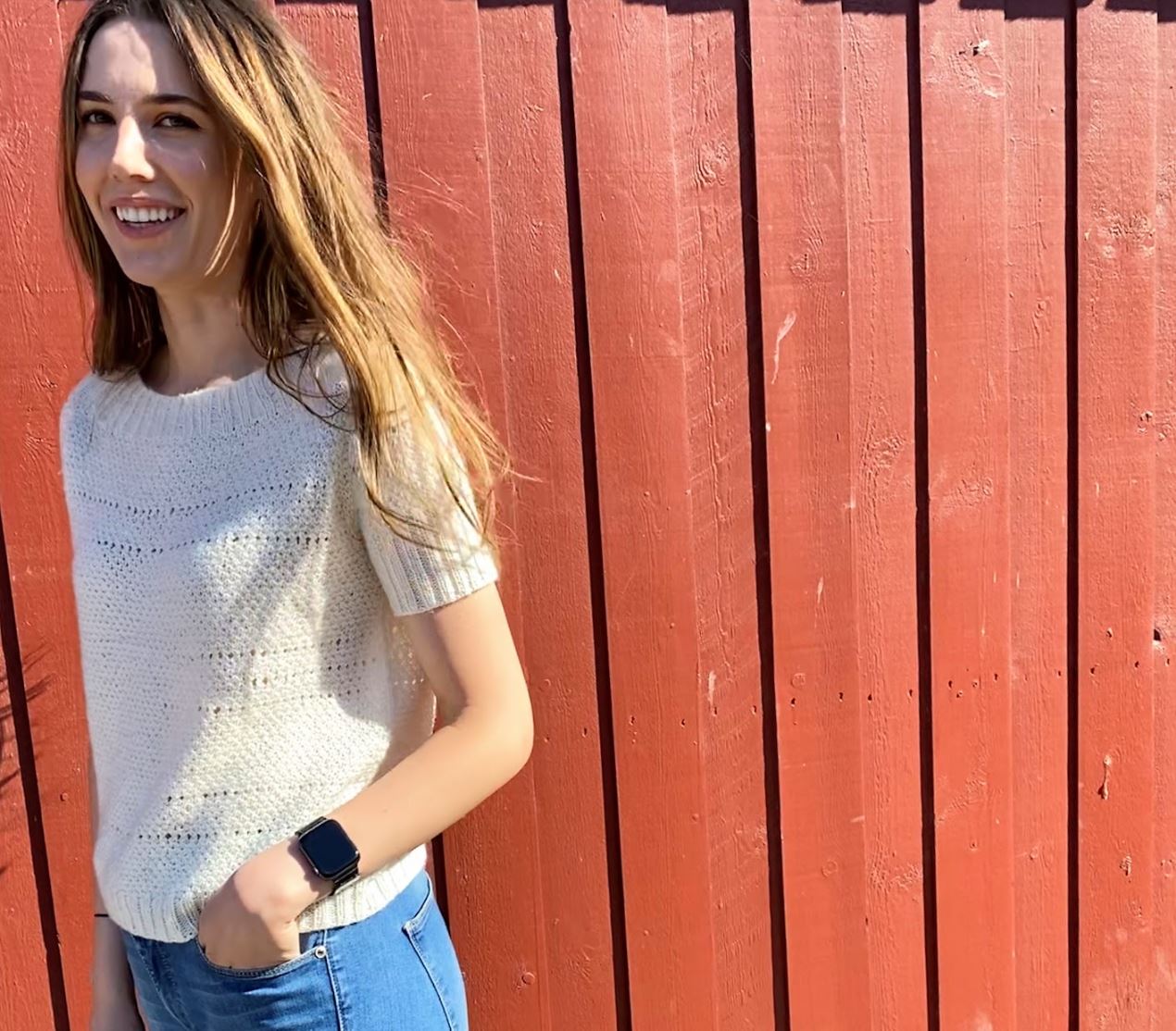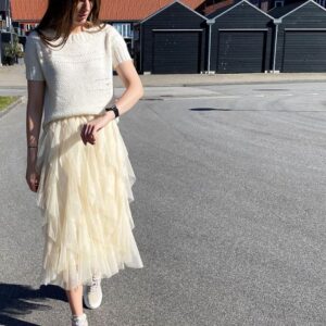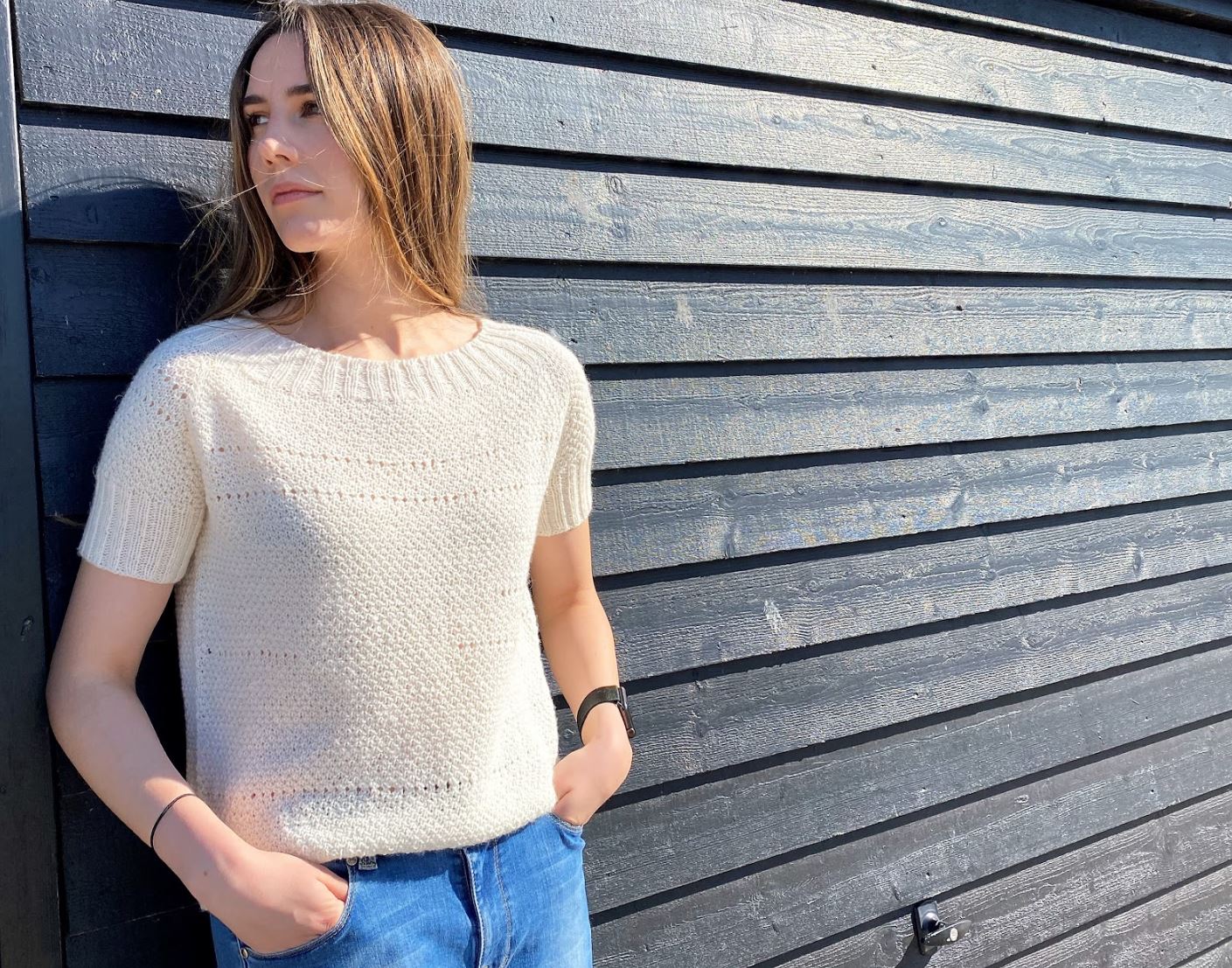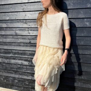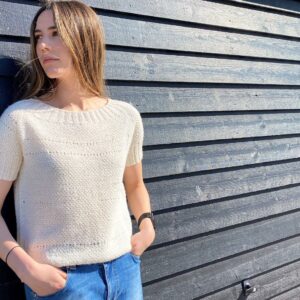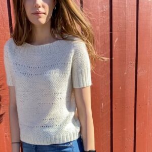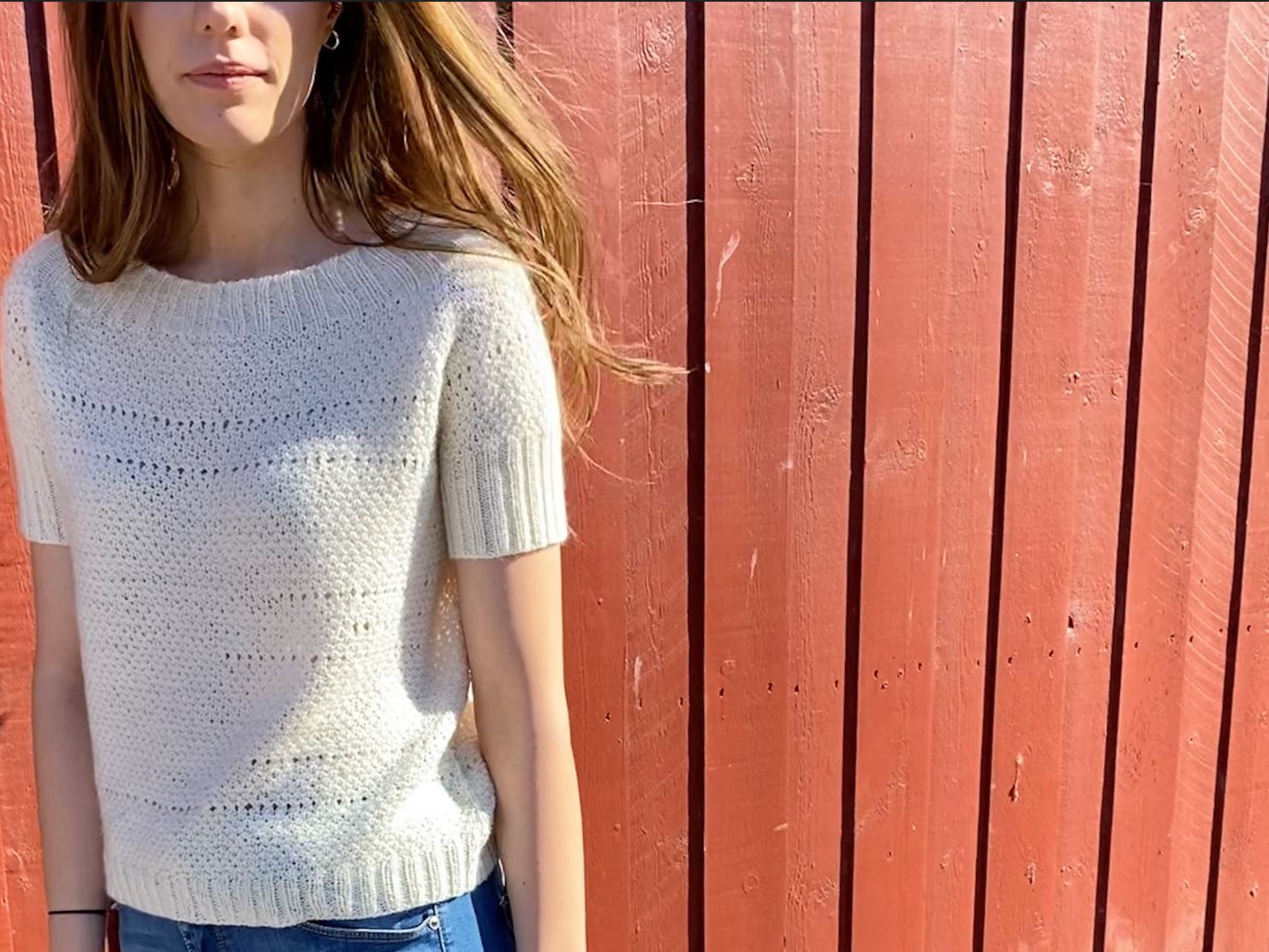 Sandhuller is a summer blouse worked top down and in the round. Sandhuller has a wide rib at neck and either randomly placed eyelets or regular rounds of eyelets at the yoke and body. The simplicity of the all-over texture of the body will encourage you to play with eyelets. Work as many or few as you please. The hem and sleeves are worked in rib.