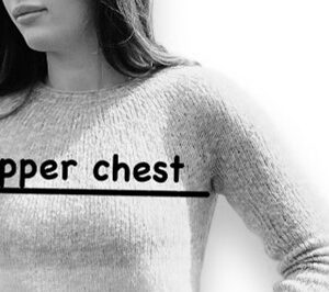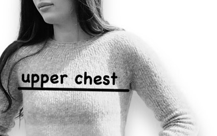 The blouse is designed to be worn without positive ease at upper chest*. Too much fabric in the yoke will create folds. Full bust and/or body circumference can be adjusted by increasing or decreasing stitches to the desired ease. *Upper chest circumference is measured just below the underarm break, with your arms down and relaxed. See photo.