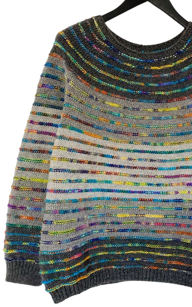 STRIBELADE (= colorful stripes) is a circular yoke blouse worked from the top down with stripes. The length of the sleeves and the body is adjustable.